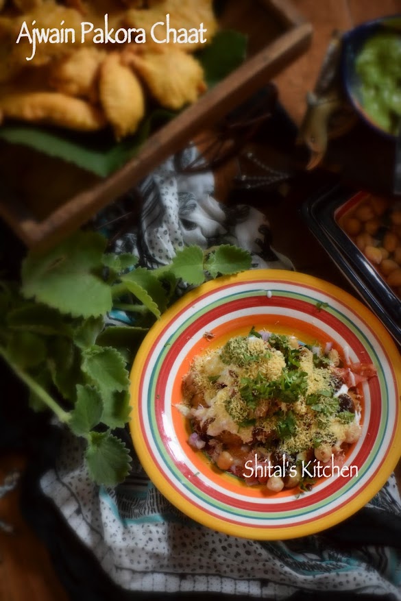 Ajwain pakora chaat is a delicious dish that is easy to prep and serve. It is fun to lay out the chaat ingredients in your fancy platters and let yours guests make their chaat while you can sit and chit-chat with them. It is a perfect party or a girls meet food!